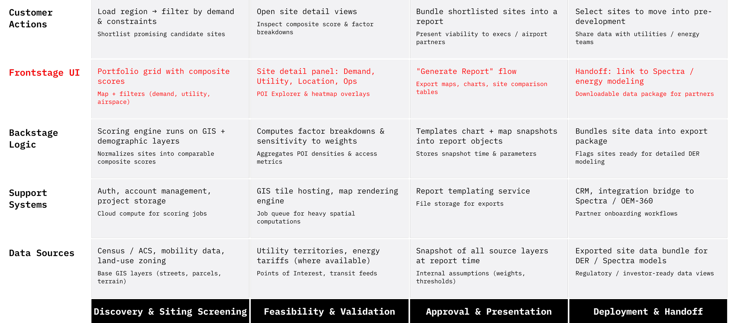 It showed us where teams slowed down. Data gathering, cross-stakeholder alignment, and site validation were all high friction processes where software could meaningfully shorten the path to a defensible siting decision.