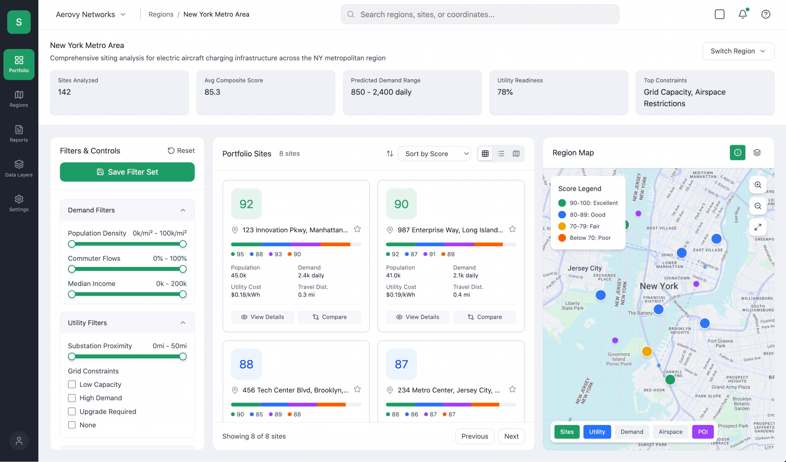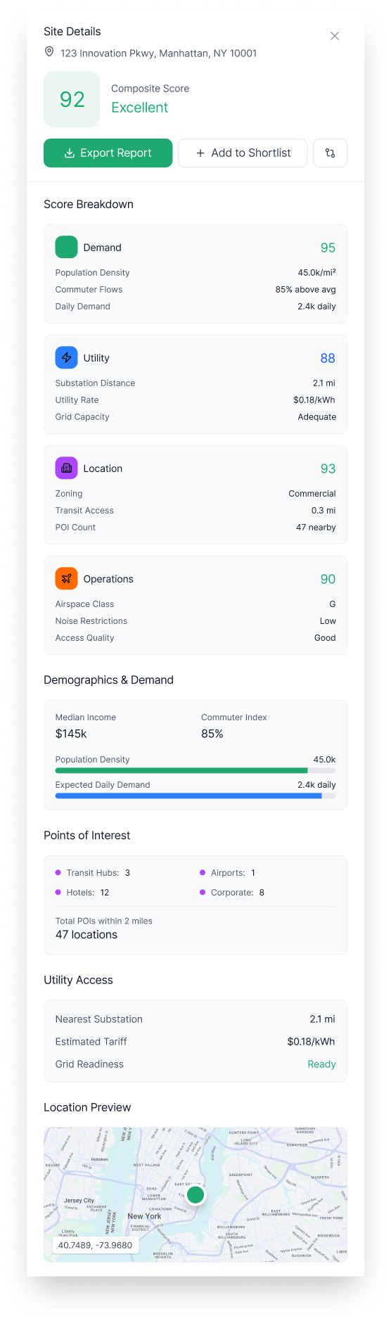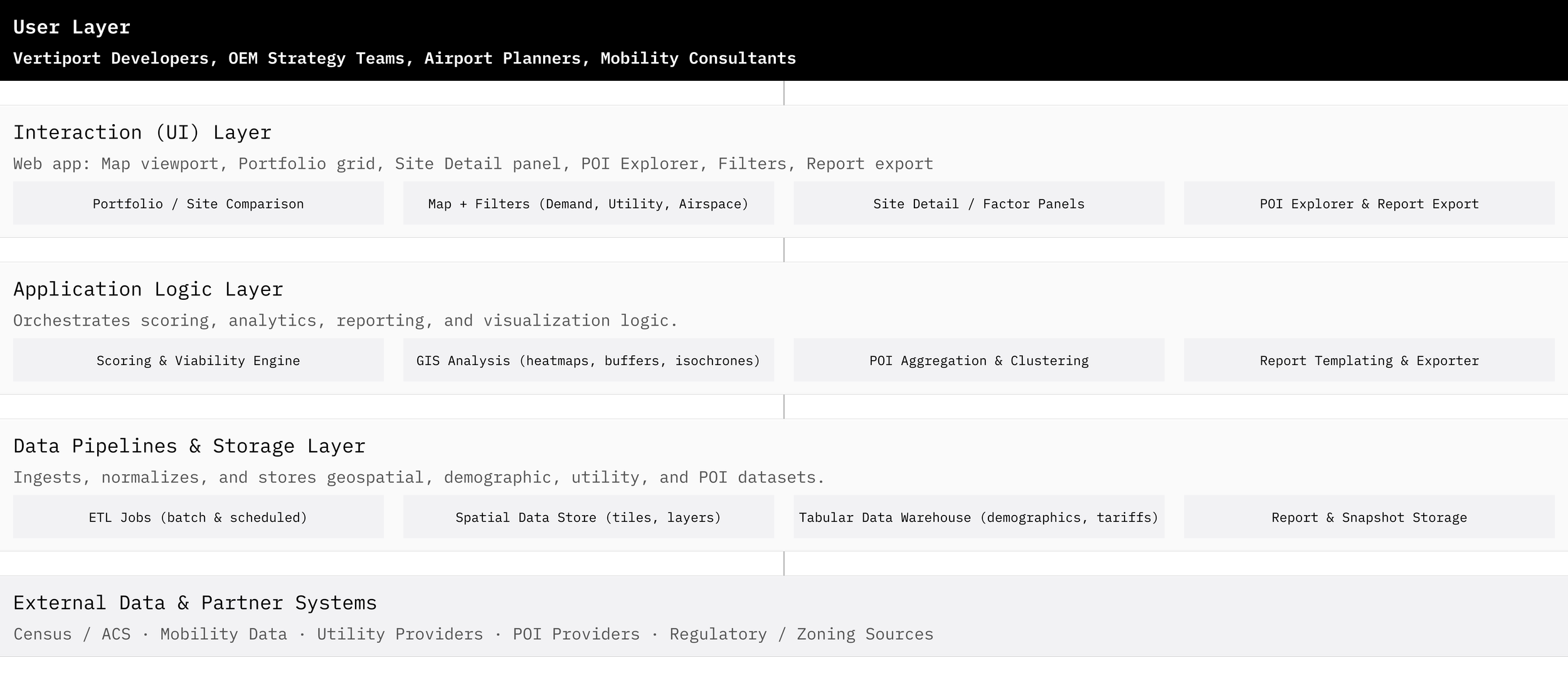 Vertiport developers, OEM planners, and airport teams needed a tool that unified demand, utility, mobility access, and regulatory constraints, because no single factor determined site viability.